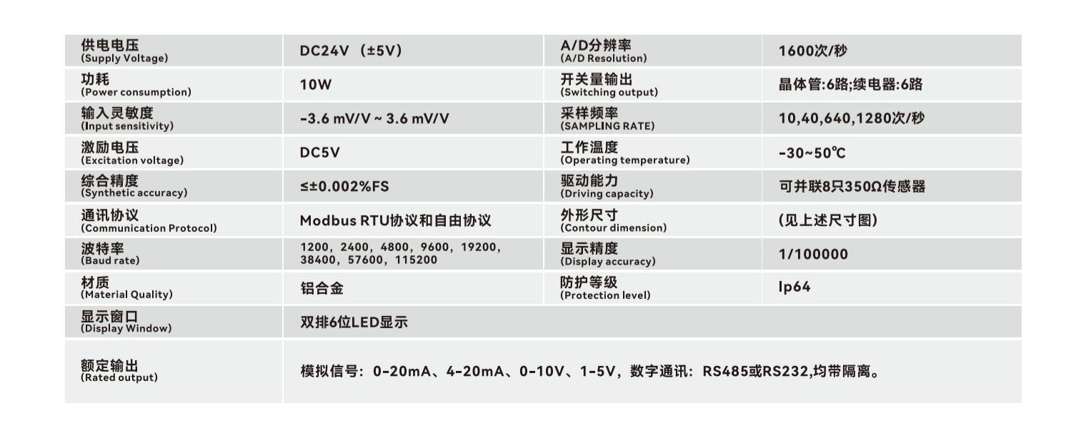 模拟输出信号可选择0-20mA、4-20mA、0-10V、1-5V,数字通讯接口可选择RS485或RS232,均带隔离。双排6位LED数码管分别显示实时测量值、峰值、输出电流值、I/0状态信。