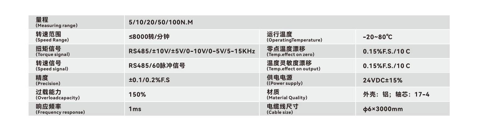 线圈电磁耦合,实现电源与测量信号无线传输,12芯一体注塑航空插头,集扭矩信号频率信号,模拟量信号,转速信号,RS485数字信号整体输出。进口轴承,寿命较长,极限转速较高,耐负荷较高,摩擦力更小。一体成型外壳,更高的硬度,更小的变形,采用车规级芯片精度性能更高、稳定性更可靠。