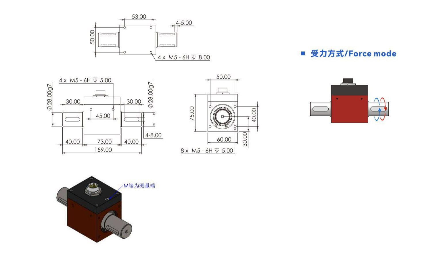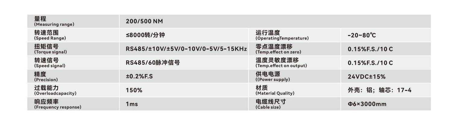 线圈电磁耦合,实现电源与测量信号无线传输。10针航空插头,集扭矩信号频率信号,模拟量信号,转速信号,RS485数字信号整体输出。进口轴承,寿命较长,极限转速较高,耐负荷较高,摩擦力更小。产品尺寸小易于安装,超大量程既可以测扭矩,又可以测转速。