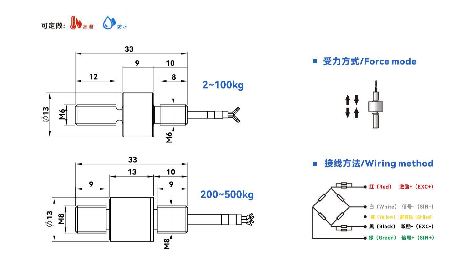 不锈钢或铝合金材料微型传感器,密封性好,可定做防水;上端出线,适合特殊安装要求。采用金属箔式应变片技术。适用于各种小空间的测力,广泛应用于工业、研发等领域的测量和控制。