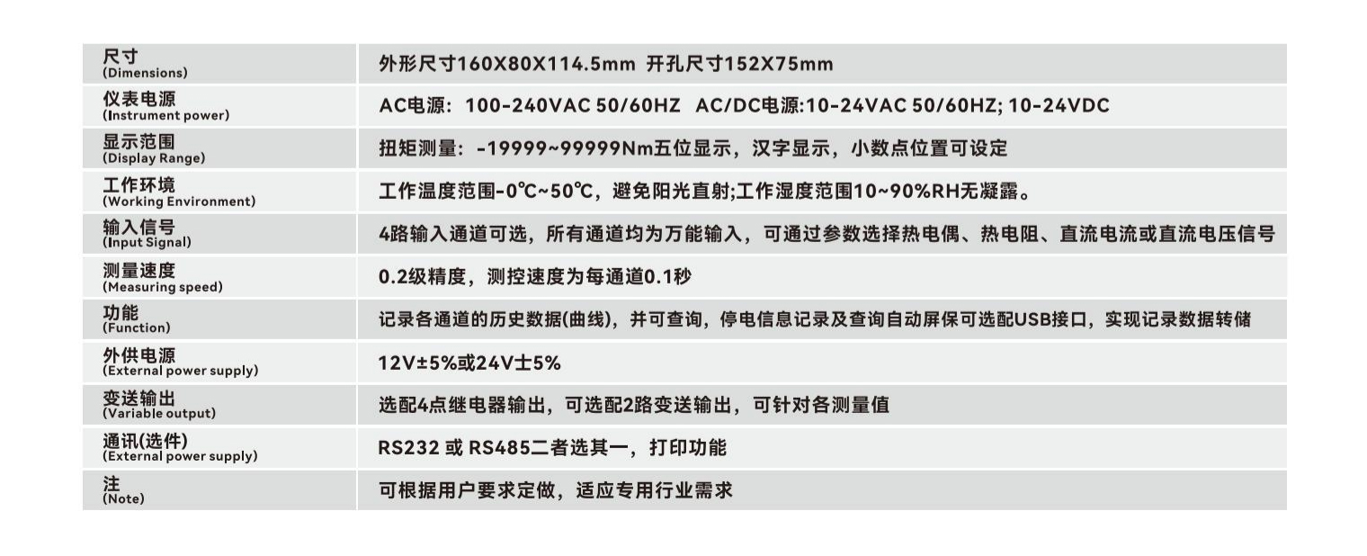 本产品配接脉冲输出转速传感器和脉冲扭矩传感器,对扭矩、转速快速测量,计算功率,具有正向和反向最大值记录。支持2路变送输出,可选配通讯接口。是一款功能齐全、操作方便、精确可靠、高性价比的产品。